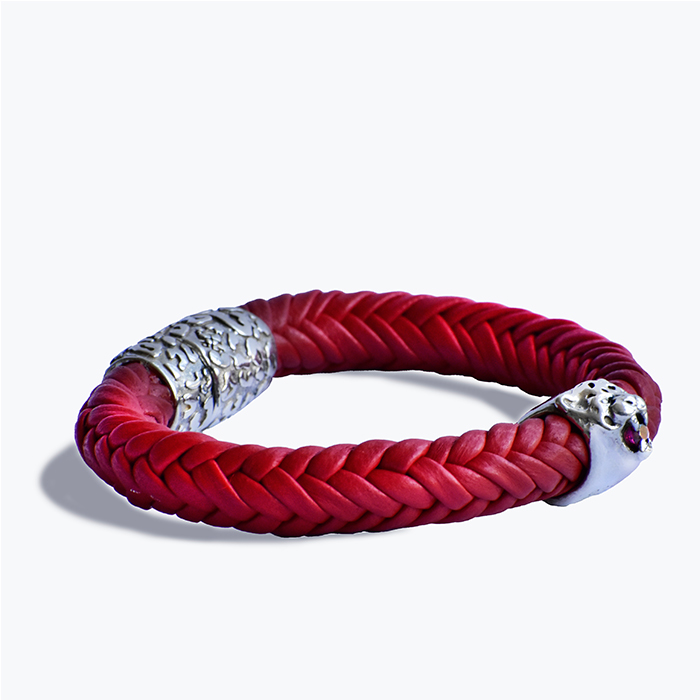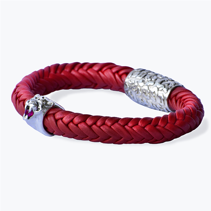 Rebelde, imponente y exótico. Símbolo de la jungla, cabeza de jaguar en alto relieve, granate rojo facetado con 12 cabos de cuero color rojo doble y finamente trenzado, broche de imán seguro, confiable y con alto relieve muestran el pelaje, tiene toda la elegancia de la Plata Ley de México limpia y pura..... 1.5 de diámetro (contáctanos para pedir tu medida)