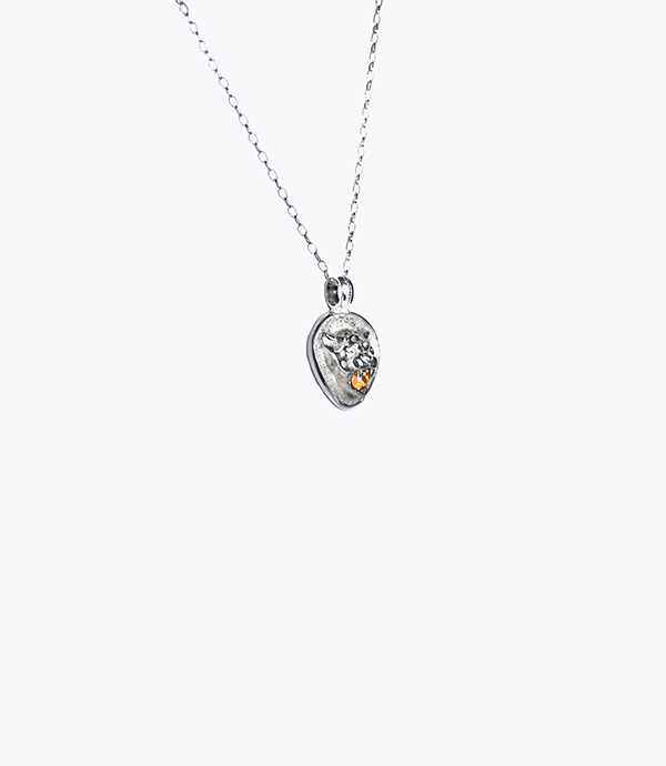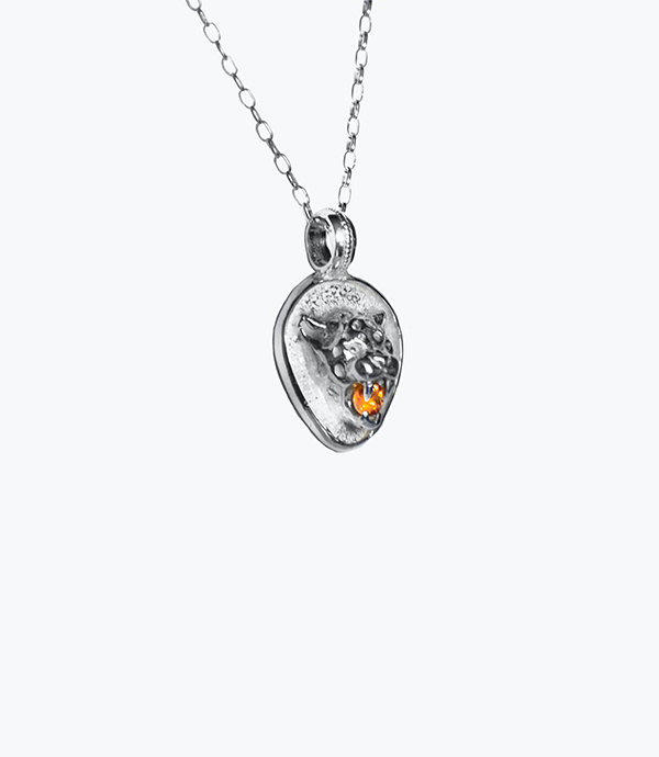 As a mystical feline sacred to the Maya, jaguars live outside the boundaries of structured society, and are considered masters of the beasts. Necklace with a jaguar charm and sapphire on the snout originally mounted on its fangs and representing a moment where it stands up to its opponent. 925 Sterling silver.