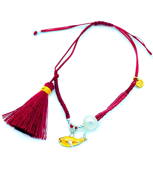 With fearlessness and confidence. This bracelet embodies the rebellious yet elegant and stylish nature of this shark with gold-plated finishes, a pearl, a pompom of fine polyester threads, fine beads in metallic red, knotted in a thick polyester thread. Self-adjustable for all sizes.